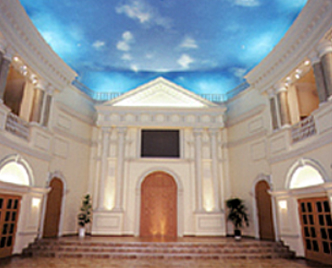 朝焼けから夕焼けまでドーム型天井に描かれた空がライティングによって情景が変わる憩いの場。広場を囲むように天然温泉やお茶のみ処があり、自由に過ごすことができます。