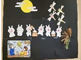 という事で、ウサギ達がお月見を楽しむ様子と、メイちゃん、トトロがコスモスの花畑で楽しむ様子をを画用紙と折り紙で作成しました。