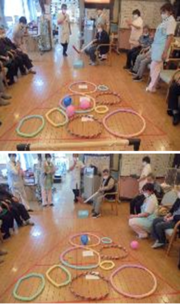 ルーレットゴルフでは、「2球とも入ったら得点を倍にするのはどうですか?」との意見が出るなど、積極的に取組む姿がみられ、身体を動かしながら楽しく脳活性できたと感じました。