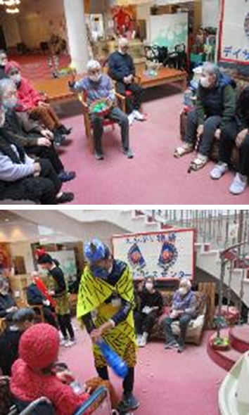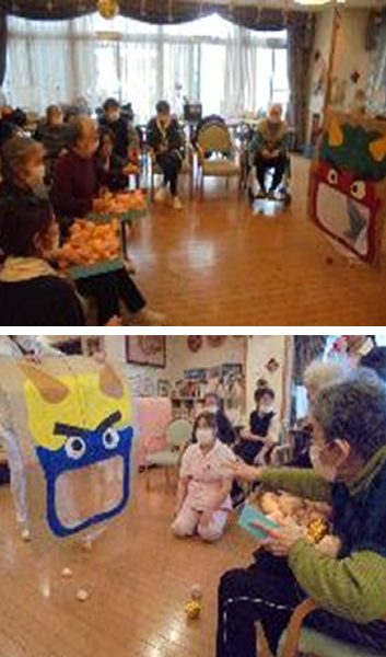 「子供と一緒に豆をまいたこともあったな」「投げたふりして食べればいい」「鬼に全部ぶつけないと」等のお声が聞かれ、職員が扮する鬼が出てくると「鬼は外福は内」「豆をぶつけたいからこっちに来て」「鬼さん頑張れ」「いっぱいぶつけれた」等と話し、皆様元気に落花生を投げておりました。