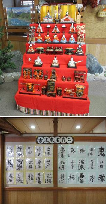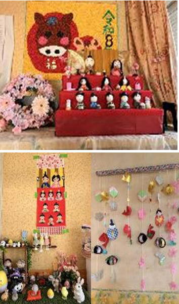 また、廊下では、つるし飾りにお雛様やぼんぼりなど作り飾っております。