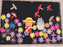 という事で、ウサギ達がお月見を楽しむ様子と、メイちゃん、トトロがコスモスの花畑で楽しむ様子をを画用紙と折り紙で作成しました。